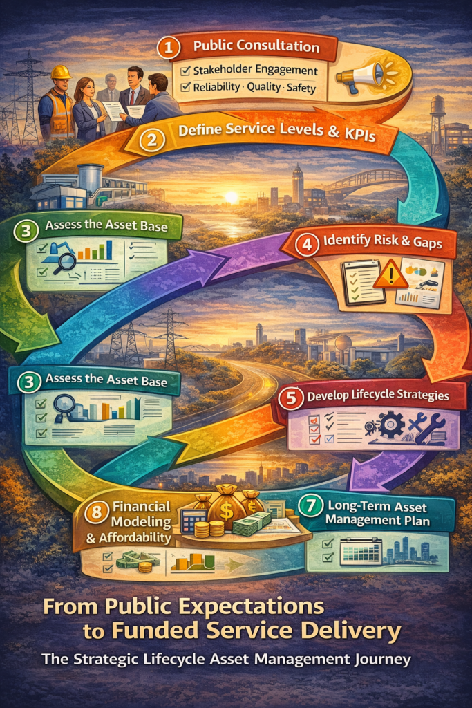 Mature asset management begins with the public — and ends with funded service delivery. Between those two points lies a structured, strategic lifecycle process that ensures infrastructure performs reliably, sustainably, and affordably over the long term.